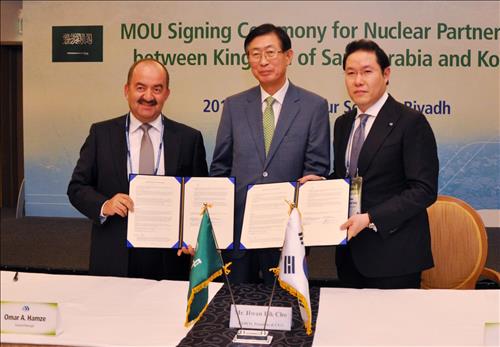 | △ 3일(현지시각) 사우디아라비아 리야드에서 열린 ‘한-사우디 원자력 협력 MOU 서명식’에서 사우디아라비아 SSEM社 오마르 A 함자 대표(왼쪽), 한국전력공사 조환익 사장(중간), 효성 조현상 전략본부 부사장(오른쪽)이 참석한 가운데, 사우디 아라비아 원전 건설의 안정적인 전력 기자재 공급을 지원하는 MOU(양해각서)를 체결했다. |