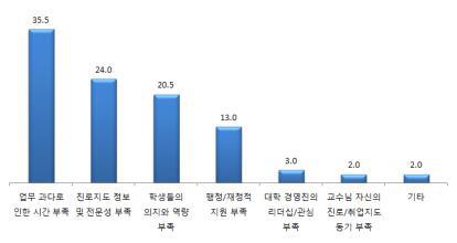 교수들은 진로지도를 할 때 업무 과다로 인한 시간부족(35.5%)과 진로지도 정보 및 전문성 부족(24.0%)을 동시에 호소했다.