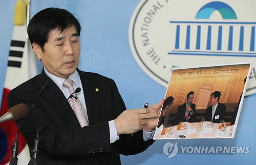 | △ 리퍼트 대사 피습 상황 설명하는 장윤석 의원 (서울=연합뉴스) 진성철 기자 = 마크 리퍼트 주한 미국 대사의 피습 현장에 있었던 새누리당 장윤석 의원이 5일 국회 정론관에서 당시 상황에 대해 설명하고 있다. |