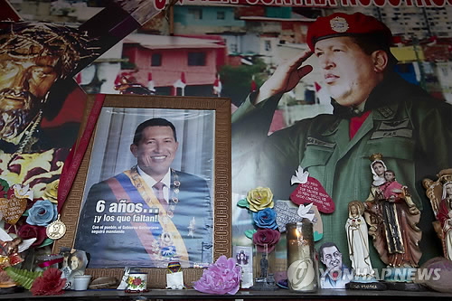 | △ 타계한 지 2년이 됐지만… (AP=연합뉴스) 우고 차베스 전 베네수엘라 대통령 사망 2주기를 하루 앞둔 4일(현지시간) 카라카스의 작은 교회 안에 차베스의 생전 모습을 담은 사진들이 놓여 있다. |