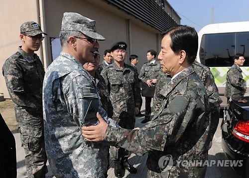 | △ 한미연합 키 리졸브 연습 현장 방문한 한민구 국방장관 (서울=연합뉴스) 한민구 국방부 장관이 6일 오후 성남 공군기지 내 미군시설에서 열리고 있는 한미연합훈련인 키 리졸브(KR) 연습 훈련개념발전 예행연습(ROC Drill) 현장을 방문, 한미장병들을 치하하고 있다. (국방부 제공) |