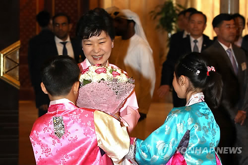 | △ 아부다비 동포간담회 참석한 박 대통령 (아부다비=연합뉴스) 도광환 기자 = 박근혜 대통령이 6일 오후(현지시각) 아부다비 시내 한 호텔에서 열린 아랍에미리트 동포 오찬 간담회에서 화동으로부터 환영 꽃다발을 받고 있다. |