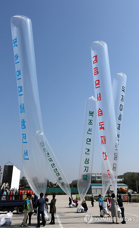 | △ 대북전단 살포 준비하는 자유북한운동연합 (파주=연합뉴스) 임병식 기자 = 북한이 정부가 대북전단 살포를 묵인하면 남북관계는 파국이 될 것이라고 경고한 가운데 10일 오전 경기도 파주시 탄현면 통일동산주차장에서 탈북자 단체인 자유북한운동연합이 대북전단 풍선을 준비하고 있다. 2014.10.10 andphotodo@yna.co.kr |