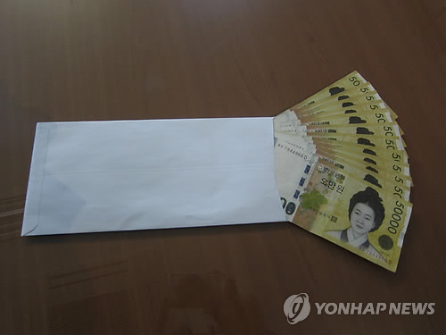 | △ 선관위가 회수한 '돈 봉투' (구미=연합뉴스) 손대성 기자 = 구미시 선거관리위원회가 전국 동시 조합장 선거를 앞두고 조합원에게 금품을 건넨 혐의로 경북 구미지역 모 조합장 선거 후보자 A씨 등 2명을 8일 경찰에 고발했다. 선관위가 회수한 돈 봉투에 5만원권 12장이 넣어져 있다. 2015.3.8. <<구미시 선관위 제공.>> sds123@yna.co.kr |
