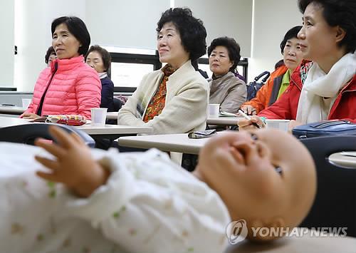 | △ 할아버지·할머니가 손주를 돌보는 '황혼 육아'가 늘고 장년·노년층의 스마트폰 사용률도 높아지면서, 50~60대이상의 모바일 쇼핑이 폭발적으로 성장하고 있다. 이들은 주로 포대기·기저귀·분유 등을 스마트폰으로 간편하게 주문하고 있었다. 사진은 서울 한 보건소에서 열린 '우리손주 육아교실'에 참여한 할머니들. |