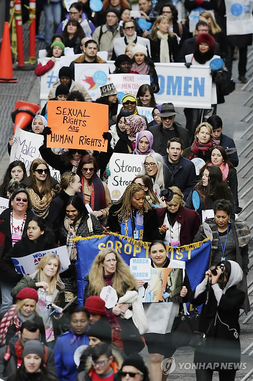 | △ '세계 여성의 날' 뉴욕 거리 행진 (AP=연합뉴스) '세계여성의 날'인 8일(현지시간) 세계 각국에서 모여든 1천여명의 사람들이 양성평등과 여성의 권익 신장을 요구하며 미국 뉴욕 맨해튼에서 거리 행진을 벌이고 있다. 이들은 유엔본부에서 타임스퀘어까지 걸어가면서 여성들이 남성에 비해 아직도 임금이 낮고 각종 정책결정 과정에서 배제되고 있다고 지적했다. |