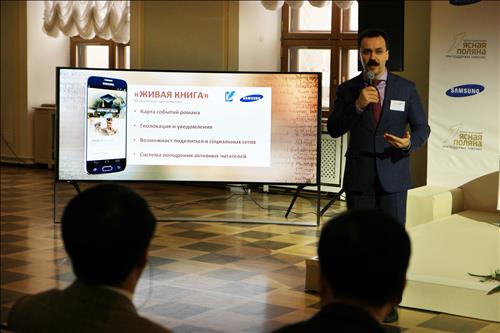 | △ 지난 5일(현지시간), 러시아 모스크바에 소재한 국립도서관 파쉬코프하우스에서 열린 제13회 톨스토이 문학상 계획 발표 행사장에서 세르게이 페브네브(삼성전자 CIS총괄 CSV담당)가 올해 새롭게 선보이는 라이브 북(Live Book) 프로그램을 소개하고 있다. |