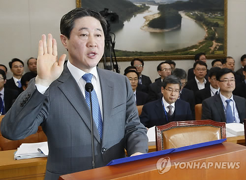 | △ 선서하는 유기준 장관 후보자 (서울=연합뉴스) 이상학 기자 = 유기준 해양수산부 장관 후보자가 9일 오전 국회 농림축산식품해양수산위원회에서 열린 인사청문회에서 선서를 하고 있다. |