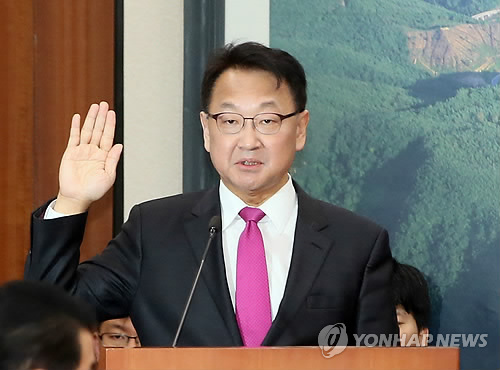 | △ 선서하는 유일호 후보자 (서울=연합뉴스) 진성철 기자 = 유일호 국토교통부 장관 후보자가 9일 국회 국토교통위원회에서 열린 인사청문회에서 선서하고 있다. |