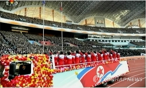 | △ 北 여자축구 대표팀, 5·1경기장에 화려하게 입장 (서울=연합뉴스) 북한 김정은 국방위원회 제1위원장이 리모델링 공사를 마친 평양 5월1일경기장에서 올해 인천 아시안게임에서 우승한 여자축구 대표팀과 월미도팀의 경기를 관람했다고 조선중앙TV가 29일 보도했다. 사진은 무개차를 타고 경기장에 등장하는 대표팀 선수들의 모습. 2014.10.29 << 북한부 기사참조 >> nkphoto@yna.co.kr |