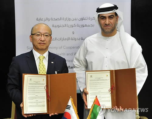 | △ 한-샤르자 보건의료협력 약정체결 (서울=연합뉴스) 문형표 보건복지부 장관이 5일(현지시간) UAE 샤르자보건청에서 압둘라 알리 알 마흐얀 샤르자 보건청 의장과 소아암센터와 건강보험 제도 운영과 관련한 한국의 노하우를 UAE에 전수하는 내용의 협력약정을 체결한 뒤 기념촬영을 하고 있다. 2015.3.8 << 보건복지부 제공 >> photo@yna.co.kr |