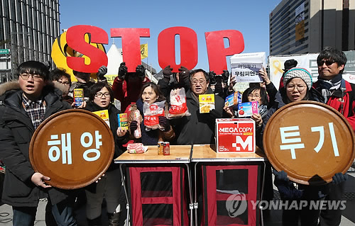 | △ 산업폐기물 해양 투기 기업 규탄 (서울=연합뉴스) 김주성 기자 = 환경운동연합 바다위원회와 환경보건시민센터 관계자들이 10일 오후 서울 광화문광장에서 기자회견을 열어 산업 폐기물 해양투기의 조속한 중단을 촉구하고 있다. 이들은 제지회사인 무림피앤피·한솔·쌍용, 식품회사인 하림·사조·동원·풀무원·한국야쿠르트·오뚜기·농협목우촌·남양유업 등 올해 산업폐기물 해양투기를 신청한 기업들의 명단을 공개했다. 2015.3.10 utzza@yna.co.kr |