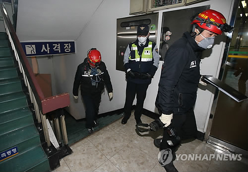 | △ 불이 난 동대문경찰서 사격장 (서울=연합뉴스) 임헌정 기자 = 10일 오후 화재가 발생한 서울 동대문구 청량리동 동대문경찰서 지하 사격장 입구에서 경찰이 출입을 통제하는 가운데 서울소방 화재조사 요원들이 사격장을 나서고 있다. |