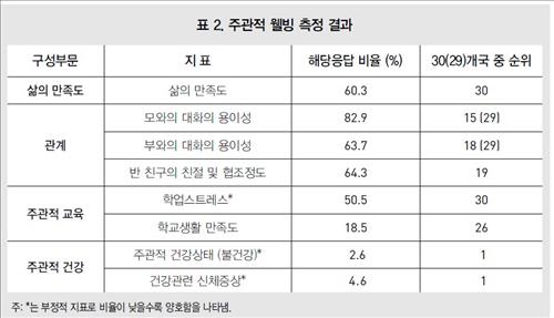 보고서는 "한국 아동들의 삶의 만족도와 학업 스트레스는 최악인데 반해 주관적 건강상태와 신체증상은 최고인 극단적인 상황"이라며 "이러한 현상은 부분적으로는 고통에 대한 높은 인내심이나 학력 위주의 경쟁적 학교 환경 등 한국의 문화, 환경을 반영하는 것으로 보인다"고 분석했다.