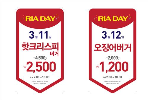(서울=연합뉴스) 최이락 기자 = 롯데리아는 11∼12일 높은 할인율을 적용해 매달 운영하는 '리아데이' 이벤트를 11일과 12일에 운영한다고 밝혔다.