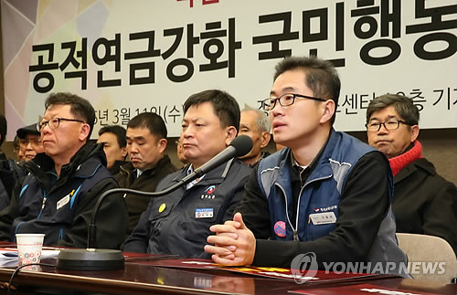| △ '공적연금으로 국민노후 보장' 국민행동 발족 (서울=연합뉴스) 서명곤 기자 = 11일 오전 서울 중구 태평로 한국프레스센터에서 열린 '공적연금강화 국민행동' 발족 기자회견에서 이충재 전국공무원노동조합 위원장이 발언을 하고 있다. |