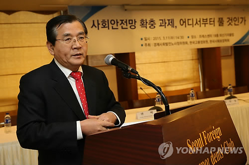 | △ 개회사하는 김대환 노사정위원장 (서울=연합뉴스) 서명곤 기자 = 11일 오후 서울 중구 태평로 한국프레스센터에서 경제사회발전노사정위원회 등이 주최한 노동시장 이중구조 해소를 위한 사회안전망 확충 방안토론회에서 김대환 노사장위원장이 개회사를 하고 있다. 2015.3.11 seephoto@yna.co.kr |