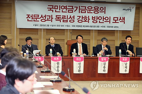 | △ 국민연금기금 운용 정책토론회 (서울=연합뉴스) 진성철 기자 = 11일 국회 의원회관에서 새누리당 김현숙 의원 주최로 '국민연금기금 운용의 전문성과 독립성 강화 방안의 모색' 정책토론회가 열리고 있다. 오른쪽 부터 남재우 자본시장연구원 연구위원, 김용하 순천향대 금융보험학과 교수, 신성환 홍익대 경영학과 교수, 원종욱 한국보건사회연구원 미래전략연구실장, 김동섭 조선일보 논설위원, 새누리당 김현숙 의원. |