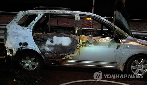 | △ 승합차 화재로 운전자 숨져 (울산=연합뉴스) 11일 오후 울산시 남구 국도 14호선을 달리던 카렌스 승합차에서 불이 나 50대 운전자가 숨졌다. 2015.3.11 << 울산시소방본부 >> hkm@yna.co.kr |