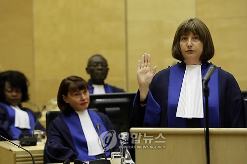 | △ 아르헨티나 출신 실비아 페르난데스 데 구르멘디 국제형사재판소(ICC) 재판관이 지난 2010년 1월 재판관 취임 선서를 하는 모습. (EPA=연합뉴스 자료사진) |