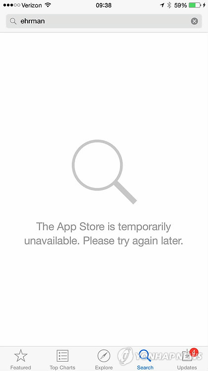 | △ 애플 아이튠스·앱스토어·아이클라우드 대규모 장애 (샌프란시스코=연합뉴스) 임화섭 특파원 = 애플의 아이튠스, 앱스토어, 아이북스, 아이클라우드, 맥 앱스토어 등 온라인 서비스들이 11일 밤과 12일 새벽(한국시간) 세계 곳곳에서 대규모 장애를 겪었다고 AP통신 등 미국 주요 언론매체들이 전했다. 장애는 한국시간으로 11일 오후 6시 조금 전부터 미국, 스위스, 홍콩, 영국 등 사용자들에게 발생했으며, 12일 오전 1시 38분 기준으로 장애가 해결되지 않고 있다. 사진은 앱스토어 사용을 시도하면 나오는 "앱스토어가 일시적으로 사용 불가능합니다. 다음에 사용해 주십시오"라는 안내 화면.2015.3.12 solatido@yna.co.kr |