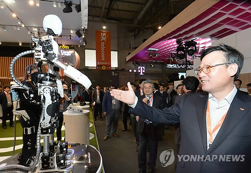 | △ SK텔레콤 장동현사장이 2일 오후(한국시간) 스페인 바르셀로나에서 열리는 '모바일 월드 콩그레스 (MWC) 2015 전시장 내 SK텔레콤 부스에서 5G 로봇과 악수 하고 있다. |