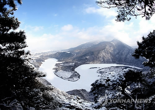 | △ 등잔봉서 바라본 산막이옛길 (괴산=연합뉴스) 변우열 기자 = 충북 괴산군 칠성면 사은리의 등잔봉에서 내려다본 산막이 옛길과 괴산호 전경. <<연합뉴스 DB>> |