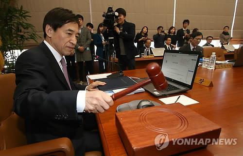 | △ 의사봉 두드리는 이주열 한국은행 총재 (서울=연합뉴스) 서명곤 기자 = 이주열 한국은행 총재가 12일 오전 서울 중구 남대문로 한국은행에서 열린 금융통화위원회 회의에서 의사봉을 두드리고 있다. |