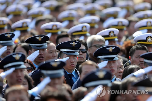 | △ 신임 장교 합동임관식 (계룡=연합뉴스) 양영석 기자 = 12일 충남 계룡대에서 열린 장교 합동임관식에 참석한 신임 장교들이 국방부 장관에게 인사하고 있다. |