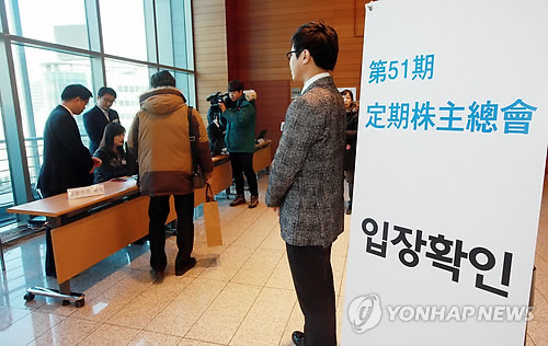 | △ 제일모직 정기 주주총회 (서울=연합뉴스) 박동주 기자 = 13일 오전 서울 명동 중앙우체국에서 열린 제일모직 정기 주주총회에서 주주 등이 입장하고 있다. |