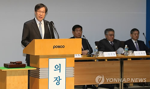 | △ 포스코 주주총회…인사말하는 권오준 회장 (서울=연합뉴스) 임헌정 기자 = 권오준 포스코 회장이 13일 서울 강남구 대치동 포스코 사옥에서 열린 제47기 포스코 정기주주총회에서 인사말을 하고 있다. |