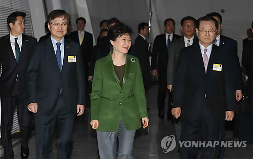 | △ 케이블TV 20주년 기념식 (서울=연합뉴스) 도광환 기자 = 박근혜 대통령이 13일 오전 서울 동대문디자인플라자(DDP)에서 열린 제20주년 케이블TV의 날 기념식에서 양휘부 한국케이블TV방송협회장(오른쪽), 최양희 미래창조과학부 장관 등과 함께 입장하고 있다. |