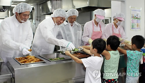 | △ 초등생 점심 배식하는 교육감과 식약청장 (대전=연합뉴스) 김병우 충북도교육감(왼쪽)과 강기후 식품의약품안전처 대전지방청장이 3일 충북 청주 한 초등학교에서 점심 배식을 하고 있다. 대전식약청은 교육청·지자체와 함께 가을 신학기 학교급식 식중독 예방 특별점검을 했다. 2014.9.3 << 대전식약청 >> walden@yna.co.kr |