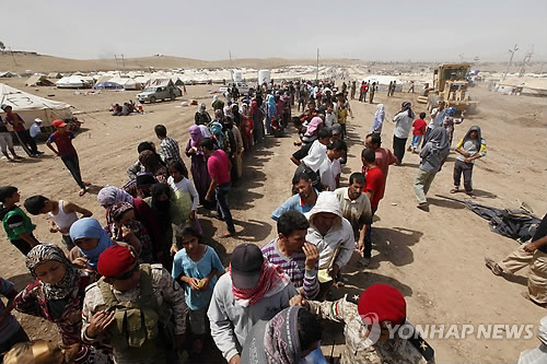 | △ 시리아 난민들이 이라크 국경지대 이르빌 난민촌에 도착해 식량배급을 받기 위해 줄지어 있는 모습. (AP=연합뉴스 자료사진) |
