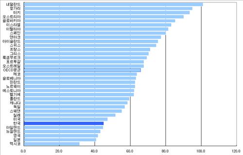 이는 주요 국제기구가 권고하는 70∼80% 수준을 크게 밑도는 수준으로 우리나라보다 연금의 소득대체율이 낮은 국가는 34개국 중 멕시코, 일본, 영국, 뉴질랜드, 아일랜드뿐이었다.