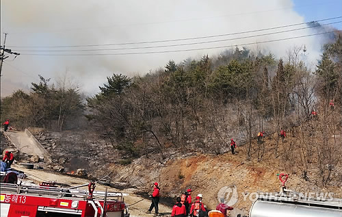 불이 나자 산림청 헬기와 임차 헬기 등 진화 헬기 2대와 펌프차 등 장비 20여대, 산불 진화 대원 등 400여 명이 동원돼 진화 작업을 벌였으나 건조한 날씨 탓에 진화에 애를 먹었다.
