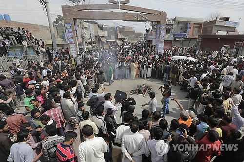 | △ 15일 파키스탄 라호르에서 14명의 사망자를 낸 폭탄 테러와 관련해 군중이 테러 관련자로 의심된다며 구타해 살해한 이의 시신을 불태우고 있다.(EPA=연합뉴스) |