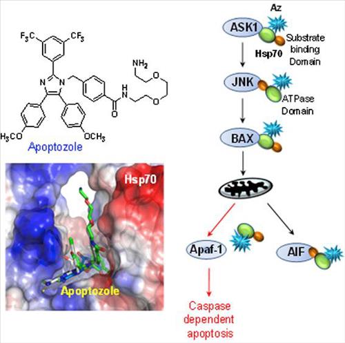 | △ 새로운 항암물질 아폽토졸(Az : Apoptozole)과 작용과정. 아폽토졸은 세포자살(apoptosis)을 막는 역할을 하는 것으로 알려진 단백질 열충격단백질70(HSP70)이 세포자살 진행에 중요한 역할을 하는 인자인 에이팝-1(APAF-1)과 상호작용 하는 것을 막아 암세포의 자살을 유도하는 것으로 밝혀졌다. |