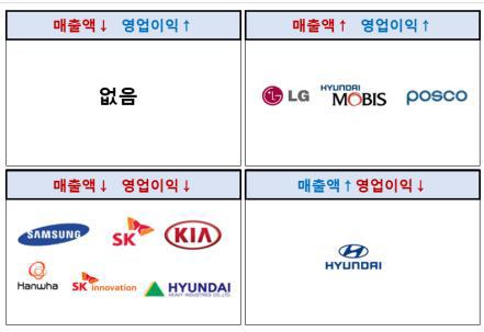 이처럼 제조업의 영업이익 감소가 컸던 것은 제조업 영업이익의 절반 이상을 차지(61.0%)하는 삼성전자, 현대자동차, 포스코, LG전자, 현대중공업, 기아자동차, 한화, 현대모비스 등 상위 8개 기업의 수익성 악화가 큰 영향을 끼쳤다.