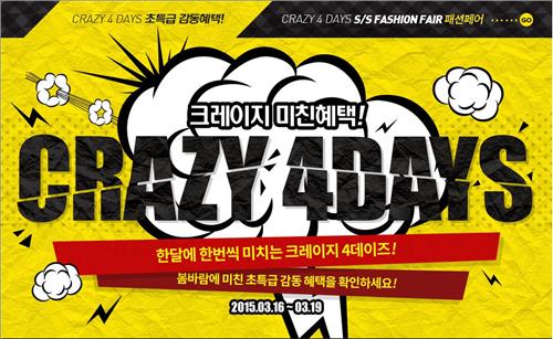 이번 '크레이지 4데이즈' 특가 행사 상품은 ▲ 16일 락앤락 에코슬림물병400㎖(3천100원) ▲ 17일 SK텔레콤 초소형 스마트빔(27만8천70원) ▲ 18일 코베아 휴대용가스렌지 3웨이 올인원(8만4천645원) ▲ 18일 아디다스 유로파드레스(10만7천844원) 등이다.