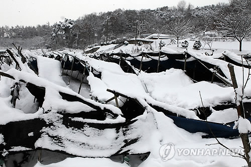 | △ 지난해 12월 폭설로 무너져 내린 충남 서산시의 한 인삼밭. (연합뉴스 자료사진) |