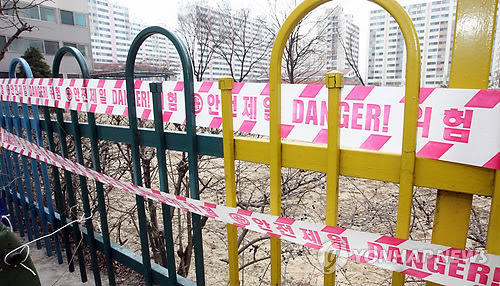 | △ 임시폐쇄된 놀이터 (청주=연합뉴스) 김형우 기자 = 17일 오전 청주시 상당구 용암동의 한 아파트 놀이터 주변에 '안전제일'이라는 출입 통제선이 처져 있다. 2015.3.17 vodcast@yna.co.kr |