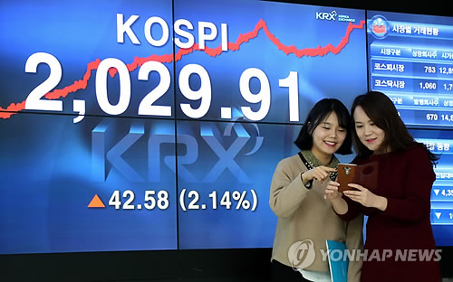 | △ 코스피 2,029.91 장 마감 (서울=연합뉴스) 코스피 지수가 전 거래일(1987.33)보다 42.58 포인트(2.14%) 오른 2,029.91로 장을 마감한 17일 오후 서울 여의도 한국거래소에서 직원들이 환하게 웃고 있다. (한국거래소 제공) |