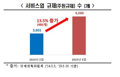 특히 정부가 집중적으로 육성하겠다고 발표한 보건·의료, 관광, 콘텐츠, 교육, 금융, 물류, 소프트웨어 등 7개 유망 서비스산업의 규제 수가 작년 2천199개에서 올해 2천544개로 345개 늘어났다.