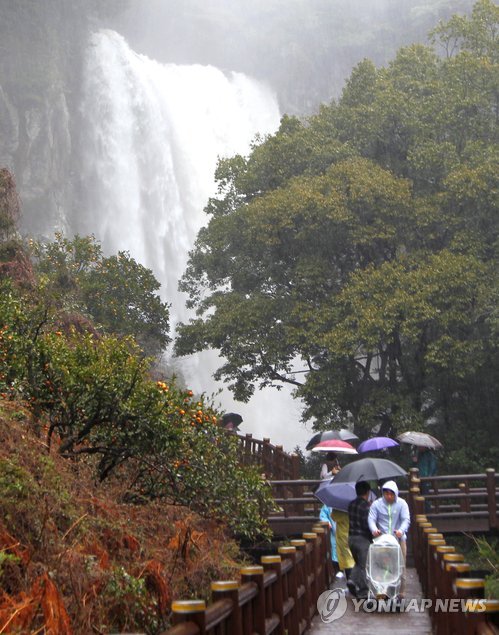 | △ (서귀포=연합뉴스) 변지철 기자 = 18일 한라산에 최고 214㎜의 많은 비가 쏟아지면서 평소 물이 흐르지 않는 서귀포시 엉또폭포가 장관을 이루자 관광객들이 기념촬영을 하고 있다. 2015.3.18 << 제주도 >> bjc@yna.co.kr |
