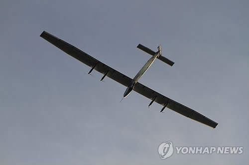 | △ (AP=연합뉴스) 태양전지 비행기로는 처음으로 세계 일주에 나선 '솔라임펄스 2호기'가 18일(현지시간) 인도 서부 아메다바드를 이륙, 세번째 기착지인 인도 북부 바라나시로 향하고 있다. marshal@yna.co.kr |