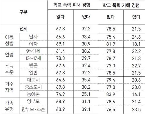 학교 폭력 피해 경험은 남자(33.4%)가 여자(30.9%)보다, 거주지역이 대도시(35.4%)인 경우가 농어촌(25.1%)인 경우보다 각각 더 많았다. 또 한부모·조손 가족(39.1%)에 속한 아동이 양부모 가족(31.1%)에 속한 아동보다 학교폭력 경험 확률이 높았다.