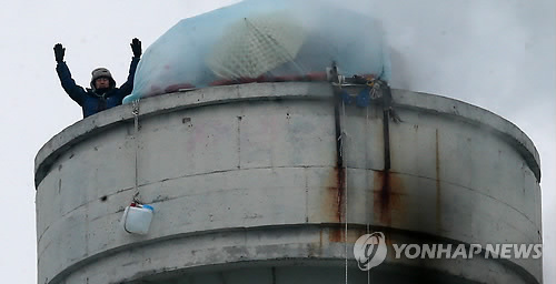 | △ 설 연휴를 하루 앞두고 지난달 17일 오전 경기도 평택 쌍용자동차 평택공장 60m 높이 굴뚝에서 해고자 복직 문제 해결을 위해 고공 농성중인 금속노조 쌍용차지부 김정욱 사무국장이 공장 밖 동료에게 손을 흔들고 있다. 김 국장과 함께 농성중인 이창근 정책기획실장 등은 오는 19일 퇴거 단행을 앞두고 해고자 문제 해결 없이는 굴뚝 아래로 내려오는 일은 없을 것이라고 밝혔다. 김 사무국장은 지난 11일 굴뚝을 내려왔다. <<연합 DB>> |