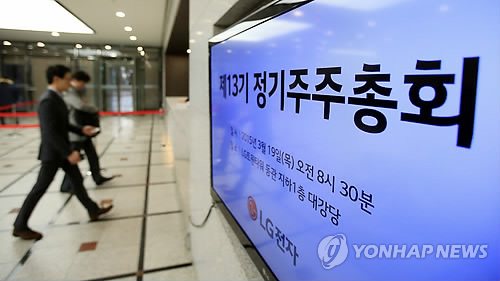 | △ LG전자 정기 주주총회 개최 (서울=연합뉴스) 홍해인 기자 = 19일 오전 서울 여의도 LG트윈타워에서 열린 제13기 정기주주총회 참석자들이 총회장으로 들어가고 있다. |