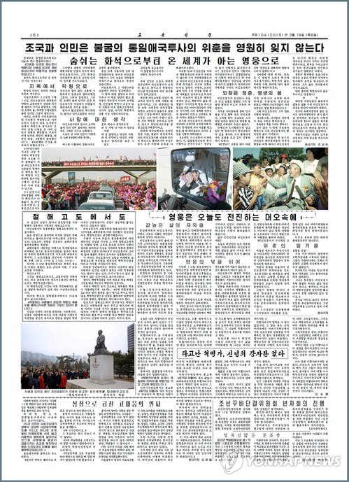 | △ 북한, 리인모 띄우기…"불굴의 혁명전사" (서울=연합뉴스) 북한 노동당 기관지 노동신문은 19일 비전향장기수 리인모(2007년 사망)의 북송일을 맞아 과거 송환 과정 등을 돌아보며 그를 '신념과 의지의 전형인 불굴의 통일애국투사'라고 칭송했다. 사진은 리인모의 삶을 다룬 이날자 노동신문. 신문 중간 1993년 북송 당시 리인모와 그를 환영하는 북한 주민들의 모습이 눈에 띈다. 2015.3.19 nkphoto@yna.co.kr |